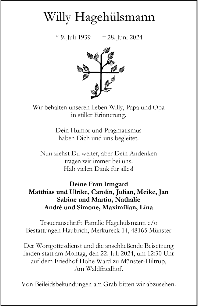 Hier finden Sie alle Traueranzeigen aus der Zeitung, die bisher für Willy Hagehülsmann erschienen sind. Weitere Traueranzeigen, die in der Zeitung erscheinen, werden hier ebenfalls aufgelistet