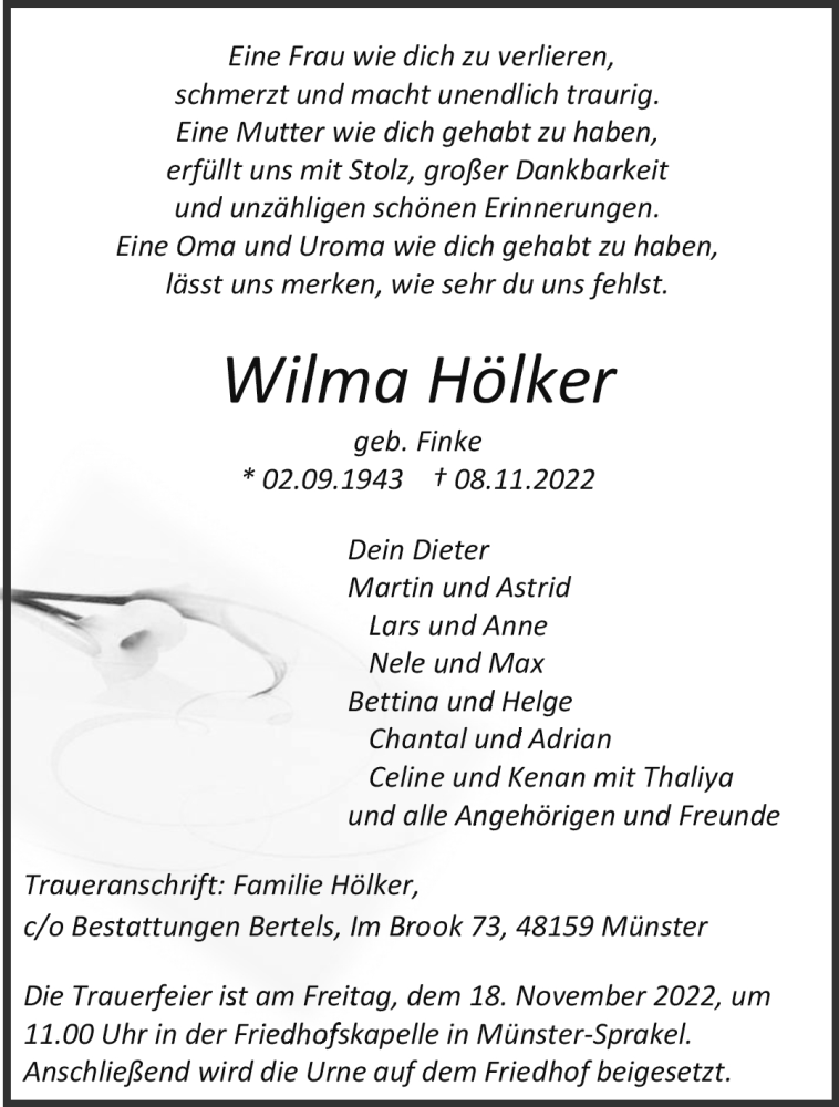Hier finden Sie alle Traueranzeigen aus der Zeitung, die bisher für Wilma Hölker erschienen sind. Weitere Traueranzeigen, die in der Zeitung erscheinen, werden hier ebenfalls aufgelistet