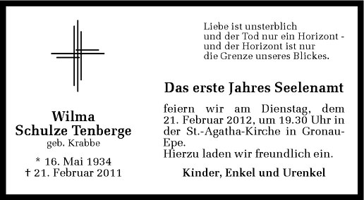 Hier finden Sie alle Traueranzeigen aus der Zeitung, die bisher für Wilma Schulze Tenberge erschienen sind. Weitere Traueranzeigen, die in der Zeitung erscheinen, werden hier ebenfalls aufgelistet