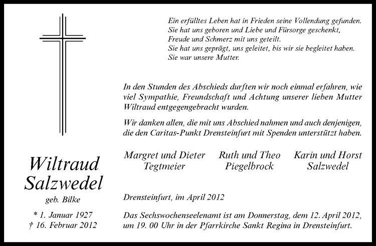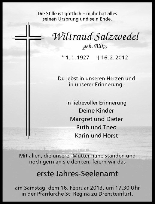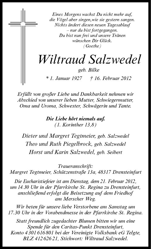 Hier finden Sie alle Traueranzeigen aus der Zeitung, die bisher für Wiltraud Salzwedel erschienen sind. Weitere Traueranzeigen, die in der Zeitung erscheinen, werden hier ebenfalls aufgelistet