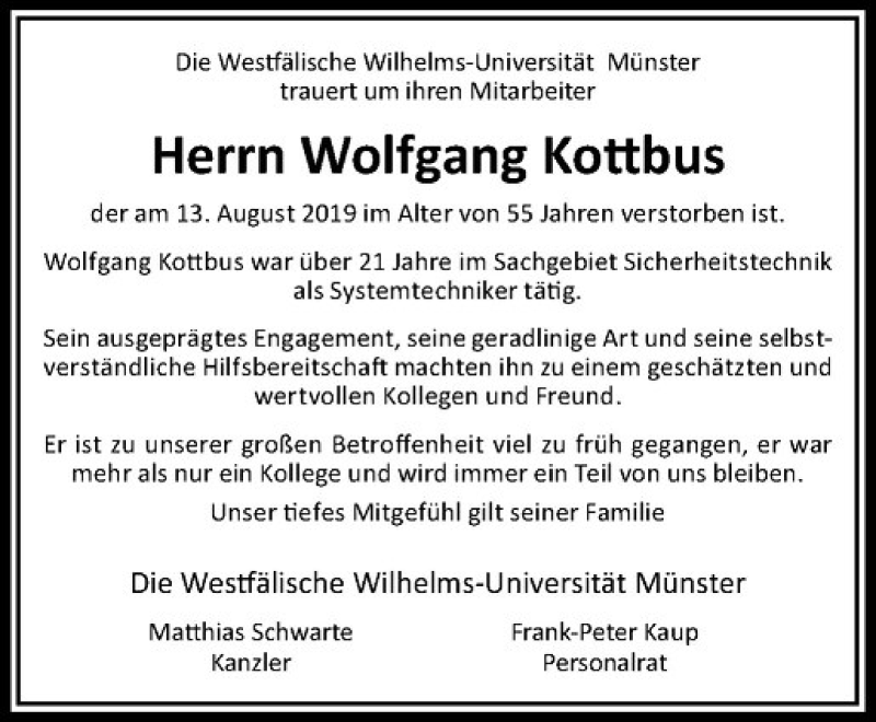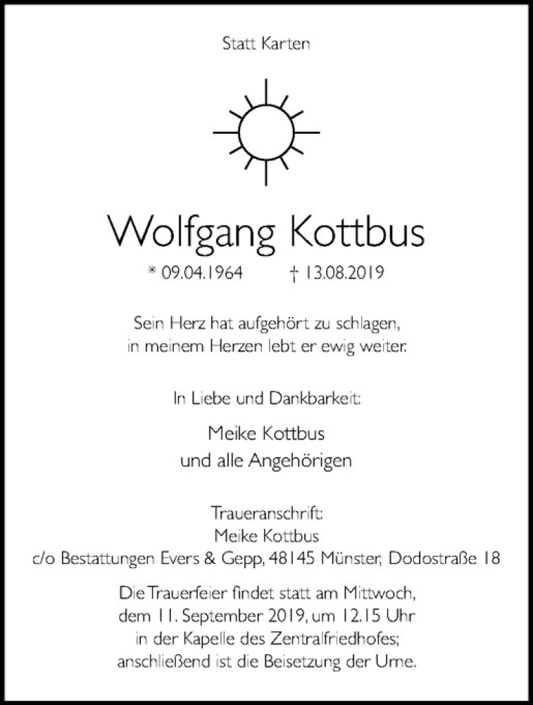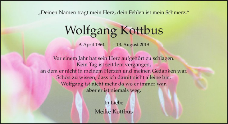 Hier finden Sie alle Traueranzeigen aus der Zeitung, die bisher für Wolfgang Kottbus erschienen sind. Weitere Traueranzeigen, die in der Zeitung erscheinen, werden hier ebenfalls aufgelistet