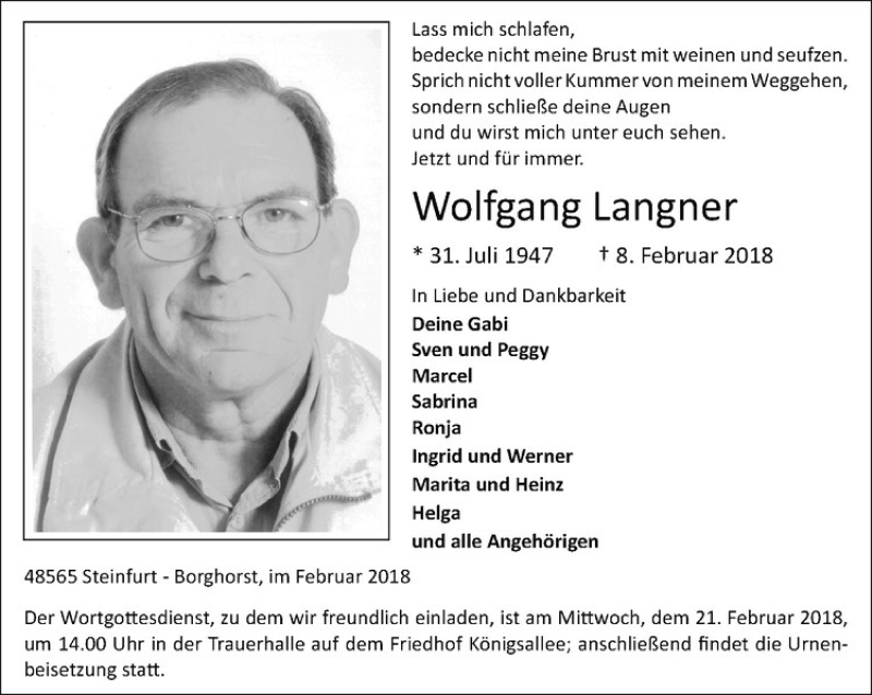 Hier finden Sie alle Traueranzeigen aus der Zeitung, die bisher für Wolfgang Langner erschienen sind. Weitere Traueranzeigen, die in der Zeitung erscheinen, werden hier ebenfalls aufgelistet