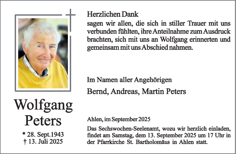 Hier finden Sie alle Traueranzeigen aus der Zeitung, die bisher für Wolfgang Peters erschienen sind. Weitere Traueranzeigen, die in der Zeitung erscheinen, werden hier ebenfalls aufgelistet