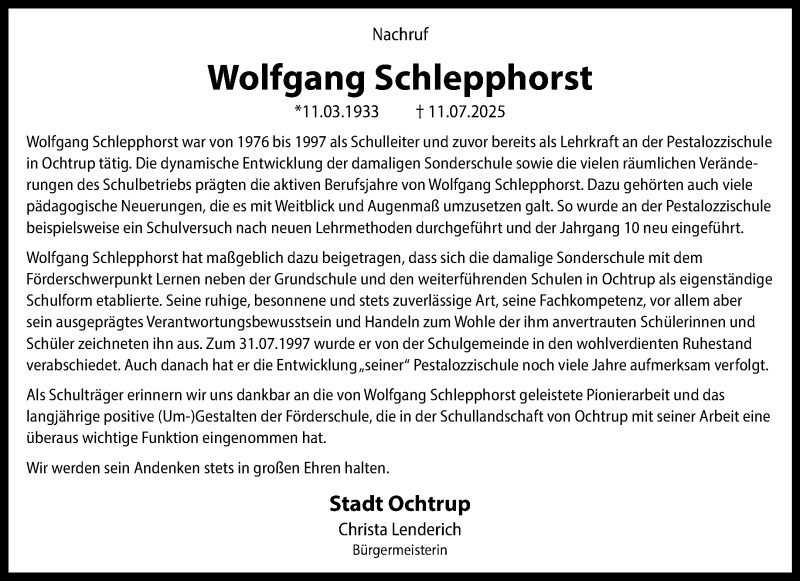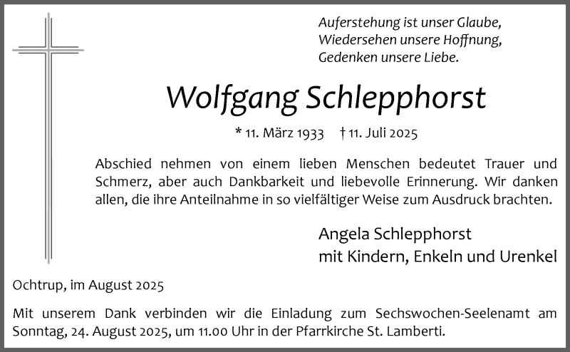 Hier finden Sie alle Traueranzeigen aus der Zeitung, die bisher für Wolfgang Schlepphorst erschienen sind. Weitere Traueranzeigen, die in der Zeitung erscheinen, werden hier ebenfalls aufgelistet