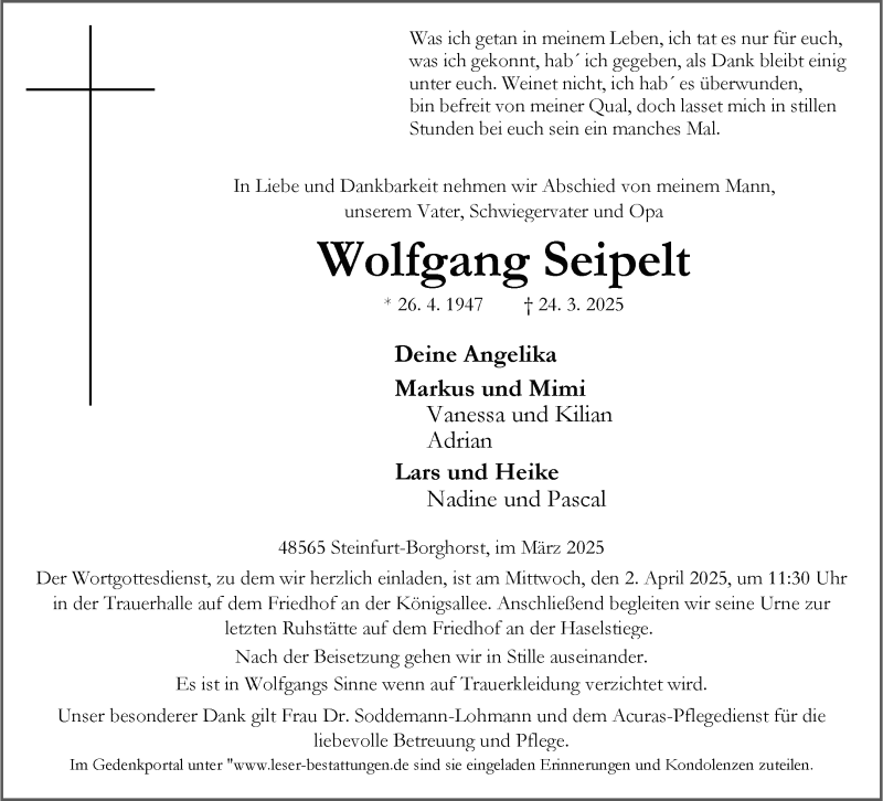 Hier finden Sie alle Traueranzeigen aus der Zeitung, die bisher für Wolfgang Seipelt erschienen sind. Weitere Traueranzeigen, die in der Zeitung erscheinen, werden hier ebenfalls aufgelistet