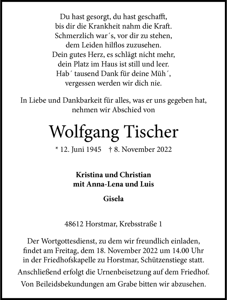 Hier finden Sie alle Traueranzeigen aus der Zeitung, die bisher für Wolfgang Tischer erschienen sind. Weitere Traueranzeigen, die in der Zeitung erscheinen, werden hier ebenfalls aufgelistet