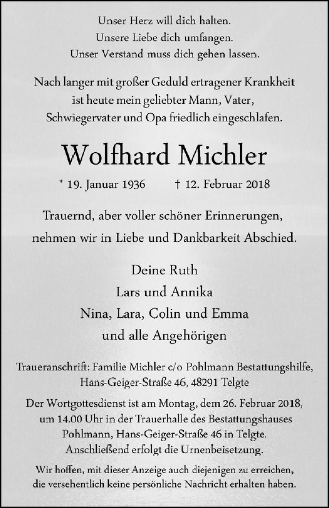 Hier finden Sie alle Traueranzeigen aus der Zeitung, die bisher für Wolfhard Michler erschienen sind. Weitere Traueranzeigen, die in der Zeitung erscheinen, werden hier ebenfalls aufgelistet