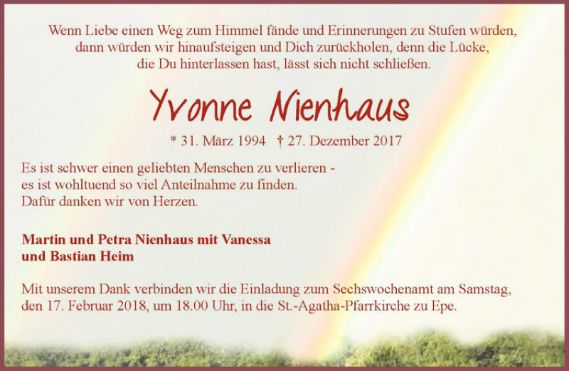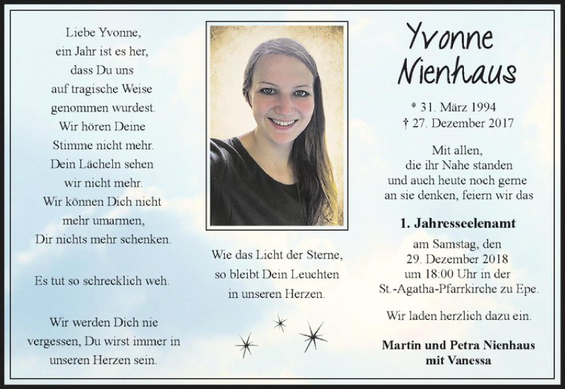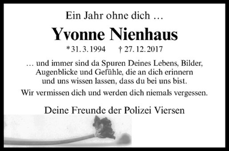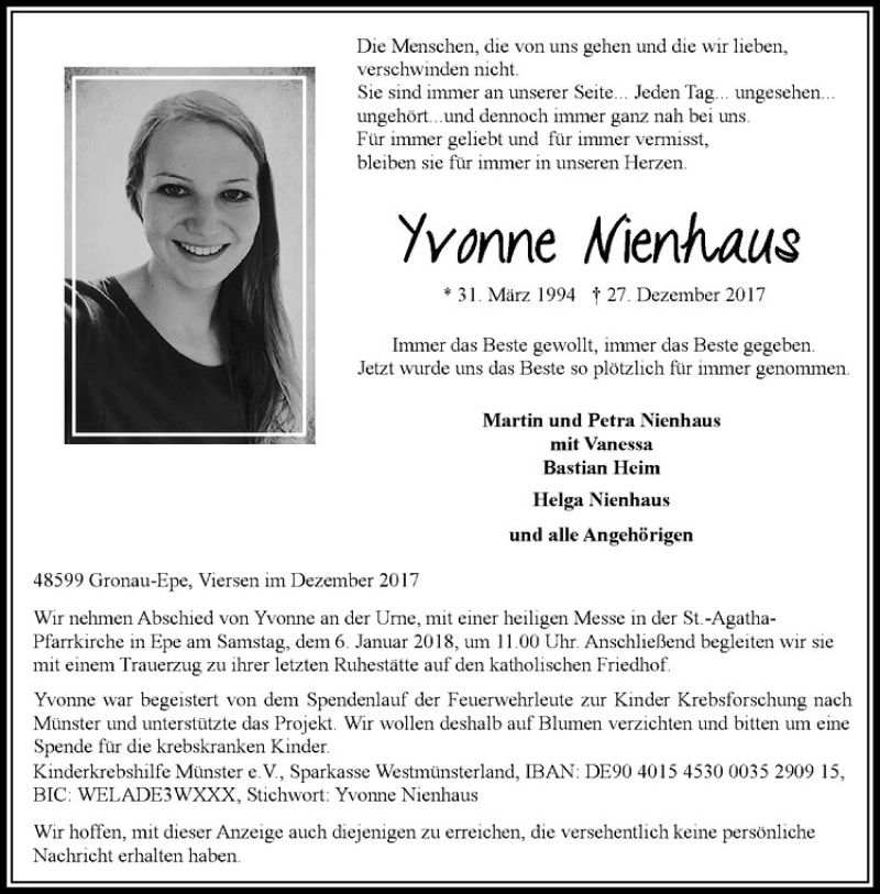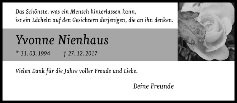 Hier finden Sie alle Traueranzeigen aus der Zeitung, die bisher für Yvonne Nienhaus erschienen sind. Weitere Traueranzeigen, die in der Zeitung erscheinen, werden hier ebenfalls aufgelistet